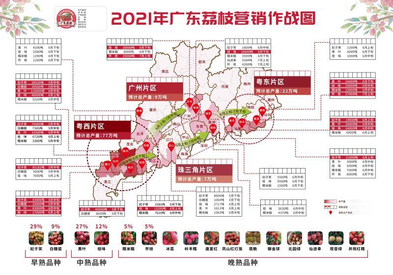 从5月上旬开始,广东140多万吨荔枝次第上市,在这张荔枝营销作战图中,按照上市时间和区域被分为四大荔枝片区,全省一盘棋打响2021年的荔枝营销战。