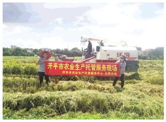 如开平市农民合作社服务中心联合农民合作社、农机推广部门、农机农资厂企等主体,成立广东农机农事服务联盟,为农民合作社及其成员提供农机农事作业服务,2020年共完成水稻作业面积约18万亩,带动农机作业面积达460万亩。