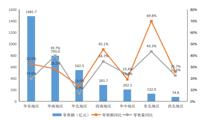 从区域分布看,全国县域农产品网络零售前100名中,有64个县级地区集中在华东地区、12个县分布在西南地区、7个县分布在华北地区、7个县分布在华南地区,其中,广东省共有南海区(饼干蛋糕,第27)、饶平县(乌龙茶,第60)、新会区(蜜饯果干,第70)、禅城区(调味品,第74)、普宁市(蜜饯果干,第76)、遂溪县(中草药,第95)等6个县(市、区)入选。