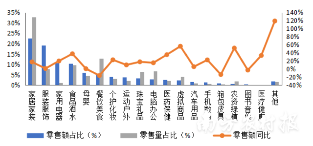从增速来看,虚拟商品、农资绿植和食品酒水分列前三,呈高速增长态势。受疫情隔离在家影响,家庭园艺热度高升,种菜、养花成为人们缓解情绪焦虑、增加生活乐趣的好方式,拉动绿植网络销售增长。
