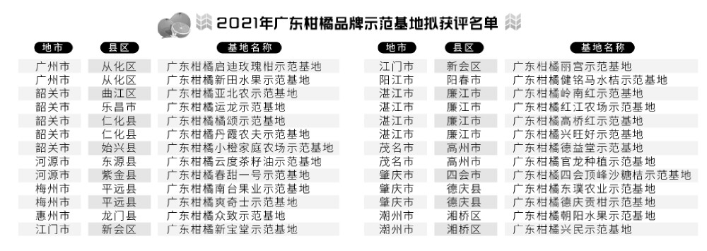 对2021年广东菠萝、龙眼、香蕉、柚、柑橘品牌示范基地获评名单进行公示,其中26个基地入选2021年广东柑橘品牌示范基地拟获评名单。