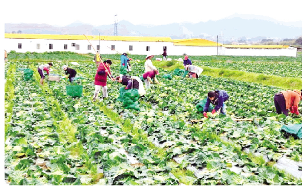 走进广东省仁化县董塘镇江头村的丹霞女蔬菜基地,二三十位村民在田间忙碌,基地仓库堆的蔬菜犹如小山,村民分工合作套网袋、打包装箱、称重登记。门口大货车装满后,立即送往订单超市及农贸市场。丹霞女农业科技有限公司负责人申丽萍说,现阶段公司上下忙得不可开交,还要准备对采收后的田块进行整地,为种植辣椒、茄子等做好准备。