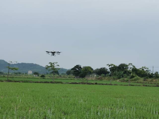 展开无人机的螺旋桨,连上电池,将肥料接入无人机底部,在遥控手柄上插上手机,一切准备停当,刘锡洪按动遥控手柄,无人机升空向稻田尽头飞去。只见几个来回下来,十几亩地就施完肥了。