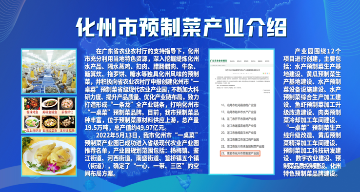 2022年,化州“一桌菜”预制菜产业园成功进入省级现代农业产业园名单。风口已现,如何作文?化州市政府邓向明市长表示“要与高人为伍”,化州市委、市政府决定拥抱“国字号”农业科创航母——广州国家农业科创中心,委托其予以高端设计、资源整合、技术集成、要素匹配、落地实施,采用工业EPC模式走出一条由科技创新激发的“科技链要素、资源变资产、资产活资本”的长效发展道路。经月余密集调研、沟通,广州国家农业科创中心依托化州生态、地理、资源禀赋,发挥当地食材数量和质量优势,融通糅合春生、夏长、秋收、冬藏传承养生文化和低油、低糖、低盐等现代保健文化,构设出了“文化特质”、“质量控制”、“功能配制”、“标准管制”、“数字定制”、“跨界研制”六维一体的一套“一桌菜”高端特色地标塑造模式。
