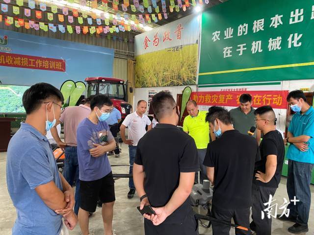 在汕尾市陆丰市,陆丰支农农机专业合作社的社员们冒着暑热出门、进田,抢收。合作社负责人颜裕裎介绍,今年,合作社早稻种植面积3000余亩,受台风影响,2~4成稻田出现倒伏情况,目前收割400~500亩。