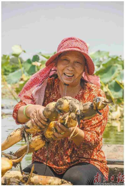 丰收季节,“米袋子”“果盘子”满满当当,“菜篮子”同样丰富稳定。立秋过后,又到了吃藕的季节,位于广州市最南端的南沙万顷沙镇是莲藕之乡,广袤的水域面积为莲藕种植提供了得天独厚的环境。由于万顷沙莲藕藕茎大、藕身圆、口感好,一直深受市场欢迎。从9月中旬开始,广州成丰生态农场的工人便开始忙碌于莲藕的采摘。