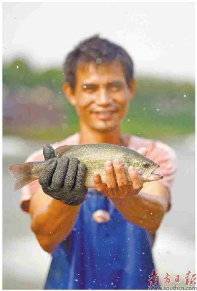 在佛山顺德勒流,工人在捕捞鲈鱼。