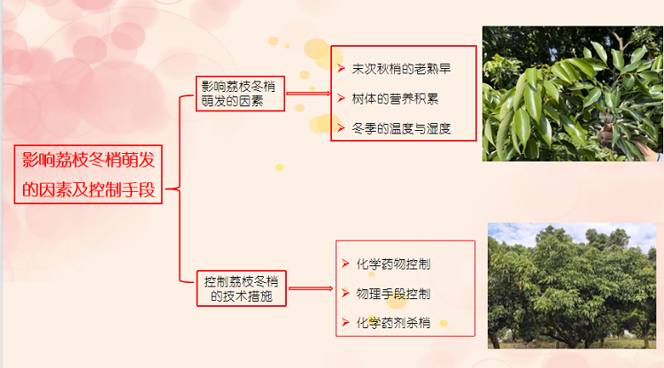 省荔枝创新团队栽培生理岗位专家郭栋梁副研究员分享了荔枝控梢促花技术,从冬梢萌发影响因素、控制手段等给出了具体的操作指引。