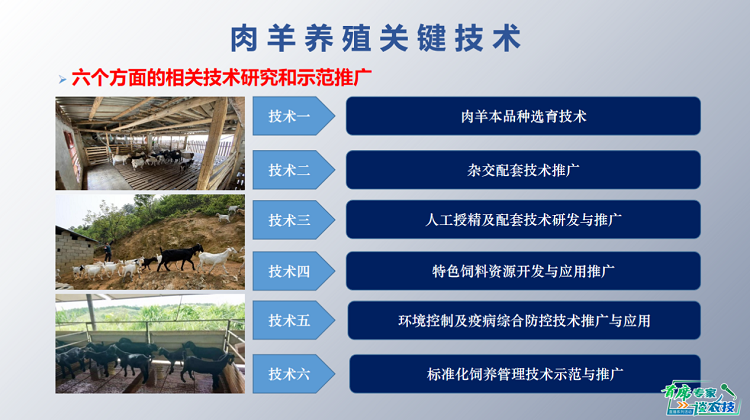 广东省现代农业产业技术体系现代草牧业(羊)创新团队建立以来,面对广东养羊产业基础薄弱、生产规模化程度低、繁育技术落后、品种退化严重、饲料供给粗放、疫病防控困难等突出问题,围绕“高效、优质、生态、安全、环保”的发展目标,重点在种质资源鉴定和优势基因资源挖掘、品种选育和杂交利用、人工授精和胚胎移植、南方特色饲料资源开发与利用、羊的营养需要和饲料配方研发、南方牧草种植及营养数据库建设、环境控制和生物安全防控、草畜一体化和标准化饲养管理等方面开展关键技术研究和示范推广,同时在社会服务、成果转化、政府决策咨询等方面积极作为,为我省养羊产业的健康发展提供了全面的技术支撑。目前已建立了服务我省肉羊全产业链的专业技术人才队伍,规范了肉羊养殖过程中各环节的生产技术规程,探索了“林下养羊、光伏养羊、公司+农户”等养羊模式,通过“饲草优质高效青贮关键技术与应用”和“华南地区羊的繁育及配套技术研发与示范推广”等项目示范,取得了良好的经济效益和社会效益。几年来,创新团队累计开展技术培训与交流会50多次,培训人员3000人次,服务省内外养羊相关企业50余家,培养研究生20多名,发表学术论文60篇,制定肉羊生产相关技术规程70套,收集羊的遗传资源样品19000多份,申请或授权专利20余件,注册新商标1件,发表著作权2项,获得国家科学技术进步二等奖1项,广东省农业技术推广一等奖1项,二等奖1项。