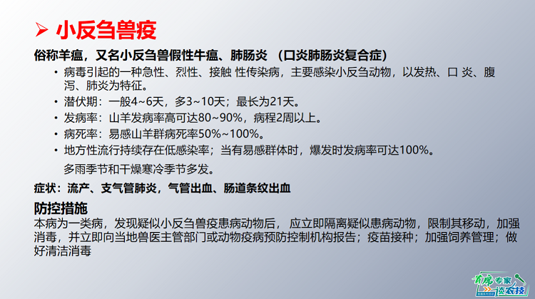 对于让养殖户头疼的羊瘟、口蹄疫、羊梭菌病等羊类易感疫病,疫病防控岗位专家贾坤博士为广大养殖户提供了针对性的综合防控方案。