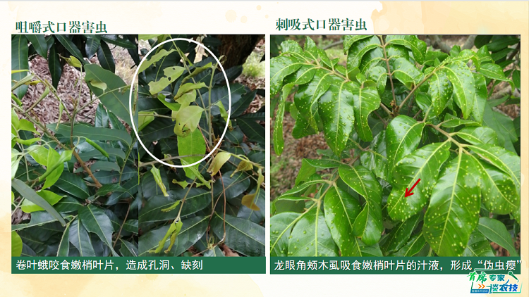 对于龙眼梢期主要害虫卷叶蛾、龙眼角颊木虱、龙眼褶粉虱等,冼继东副教授分别就“咬食”和“吸食”两类害虫为害症状识别、虫害防治等为广大龙眼种殖户提供了针对性的综合防控方案。强调:使用药剂防治害虫时,一定要选对防治的适期(最佳用药时期)和选对(有效的)药剂。”