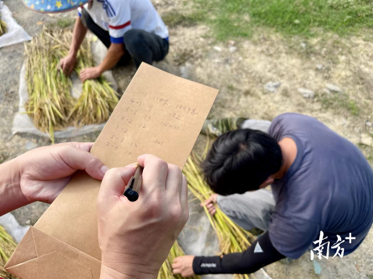 广东省农科院科研人员在惠州市博罗县开展水稻化肥减施新技术的研究,通过采集、分析水稻有效穗、穗实粒数等产量关键农艺指标,考察新技术的增产增收效果。南方日报记者 邵一弘 摄
