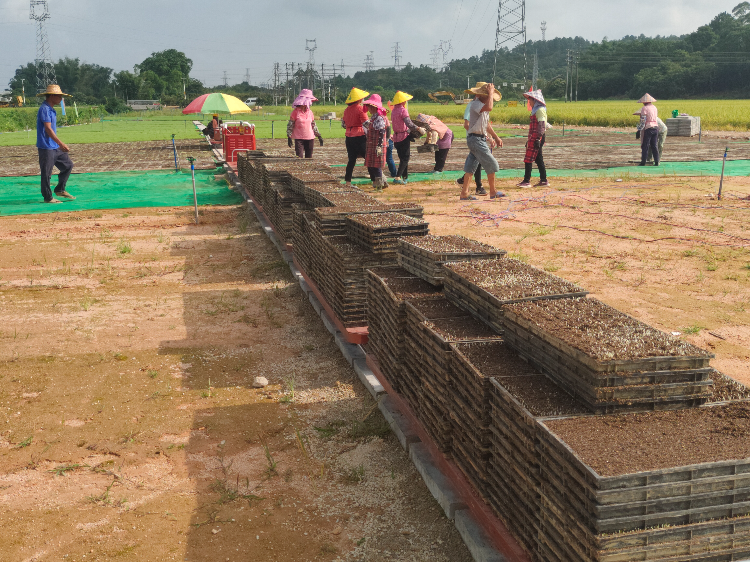 摆盘、铺土、播种、覆土……在广州市从化区的育秧大棚内,现场一派繁忙。整条水稻育秧流水生产线上,各道工序紧锣密鼓,环环相扣。一个个育秧盘里,装满了有机质土,被刮平、加湿后,进行叠盘,一盘盘水稻秧苗就被输送进保温室内催芽。72小时后,秧苗将被拉到大田里培育,为春耕生产提供高标准规格的机插秧秧苗。