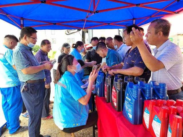 另一边,中石油揭阳销售分公司工作人员在活动现场详细讲解了中石油农机作业用油的优惠政策,手把手帮农机手下载APP办理加油优惠卡,同时还用量杯向农机手展示了澄黄透亮的农机作业用油,演示了为农机加油的操作流程。