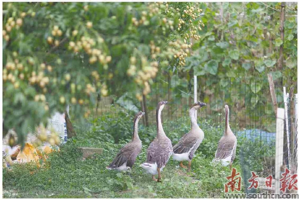 黄皮树下,一群鹅悠闲地走过。冯章 摄