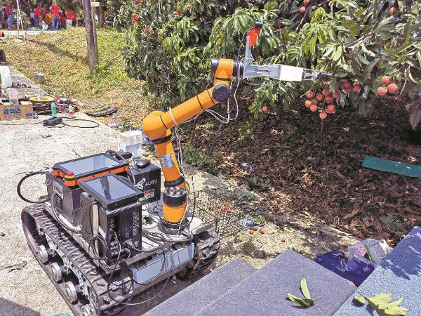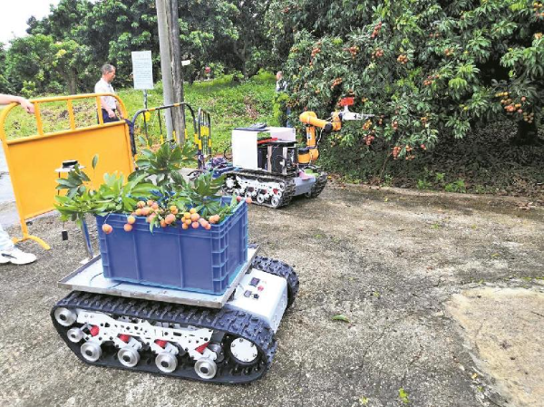 自走式单轨山地果园运输机、多功能机器人喷雾机、荔枝采后智能分选设备……这些设备在荔枝生产中都可以大大节约劳动成本。其中最受瞩目的当属荔枝采摘机器人,机器人具备自主规划采摘路径、自动寻路、自主避障等功能,精准完成荔枝的采摘作业,作业效率约为每10秒一串果实,成功率高达90%,可有效提高果农收益。