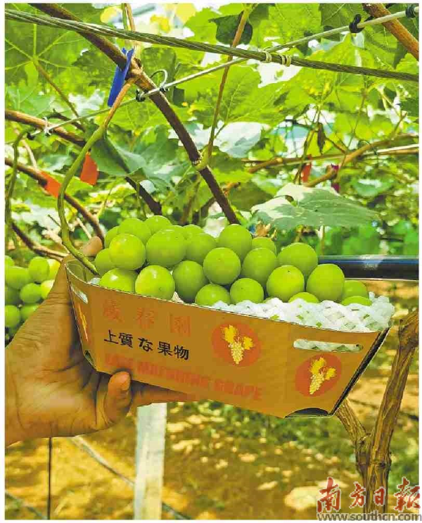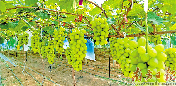 在英德市九龙镇淼鑫阳光玫瑰葡萄园,70亩的“阳光玫瑰”色泽鲜艳、青翠欲滴,工人正为葡萄套上防护袋,防止病虫侵害。葡萄园负责人罗金水介绍,园内主打“阳光玫瑰”,该品种口感细腻、甜味十足、果实饱满,还带有淡淡的玫瑰香气,是一种优质的葡萄品种,每亩产量约2500斤。“我们计划在8月1日开放葡萄采摘,葡萄园距离峰林晓镇旅游景区不足1公里,是集采摘、休闲、垂钓和旅游观光于一体的种植基地,应该会吸引不少游客前来体验。”