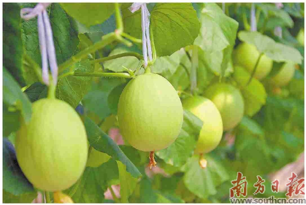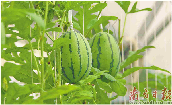 在英德市连江口镇连樟村现代农业科技示范园,工人正采摘着新品种碧月西瓜。与传统种在地上的西瓜不同,碧月西瓜挂着网长在空中,工人们开着升降车便可以轻松采摘。