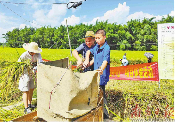 “割的时候,刀口要向下,手要抓住稻根。”丰收现场,游客带着孩子们下地干活,手把手地教孩子收割稻谷。另一边,伴随着打稻机的轰鸣,丰硕的谷米倾泻进了米袋……骄阳似火,生态田园间呈现出一派忙碌而欢乐的景象。“希望通过这样的活动,让下一代在实践中感受‘粒粒皆辛苦’,培养孩子们爱惜粮食、节约粮食的意识。”参与丰收活动的游客说。