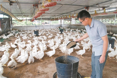 2020年,在外打工的连平县三角镇新村农民朱连阶回到老家,在三角动物卫生监督分所所长严少密的引荐下,试养了2000多羽广西樱桃谷白鸭,养殖不到2个月,首批白鸭全部卖出,纯利润就有1万多元。尝到甜头的朱连阶,开始规模化养殖白鸭。