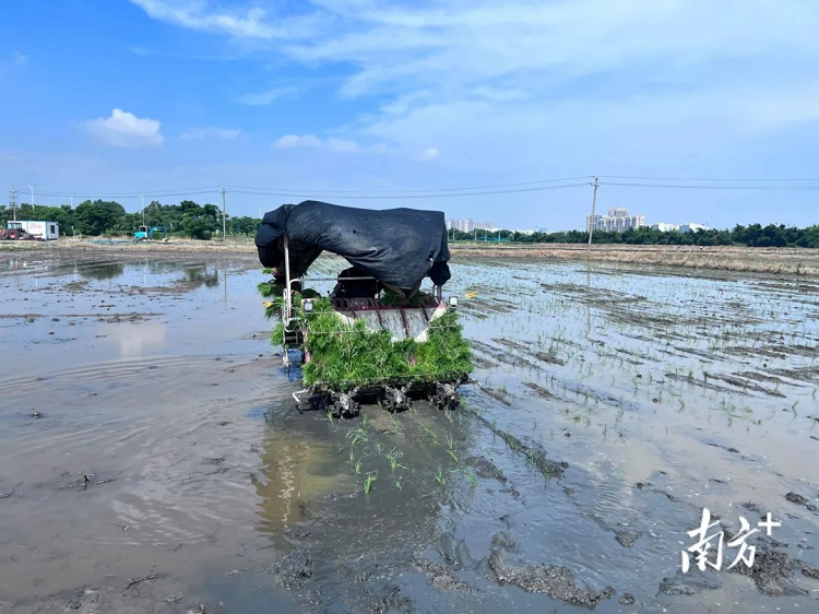 “机器插秧每天可完成40-45亩地的秧苗插入工作,2天便完成全部田地的插秧;而人工插秧10人得近10天才能完成,而且育秧时人工播种不均匀,容易导致稀疏不整齐。”许免坚告诉记者,前几造,农场采取了无人机播种、打药、施肥,达到水稻生产轻简化目标,晚造水稻他们全部种植丝苗米“19香”品种,采取机械化插秧,更好地确保全苗,有利于水稻的高产稳产。