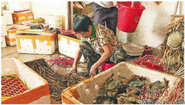 在程村镇的一个螃蟹收购点,箱子里装满了鲜活的螃蟹,有个头颇大的肉蟹,也有满肚脂膏的膏蟹。几位外地过来的批发商正在挑选螃蟹,店员们则熟练地用草绳捆绑好螃蟹,然后打包过秤。