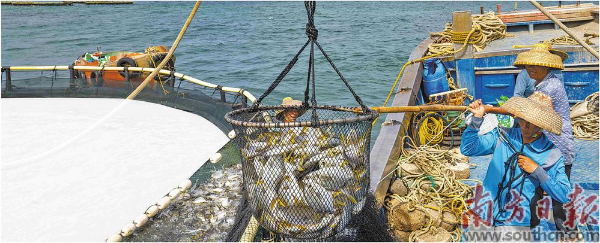 “我们只要两个网箱就能捕到一万多斤金鲳鱼,休渔期也比较好卖,收购价每斤15元左右。”据阳西县益晖深海水产养殖科技有限公司相关负责人介绍,该公司一共有45个网箱,金鲳鱼加工后销往省外市场。