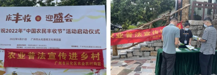 9月21日,“广州市从化区庆祝2022年中国农民丰收节活动”启动仪式在从化区荔枝文化博览园举行。从化区农业农村局在活动现场开展了“乡村振兴”和“普法宣传进乡村”等普法宣传活动。