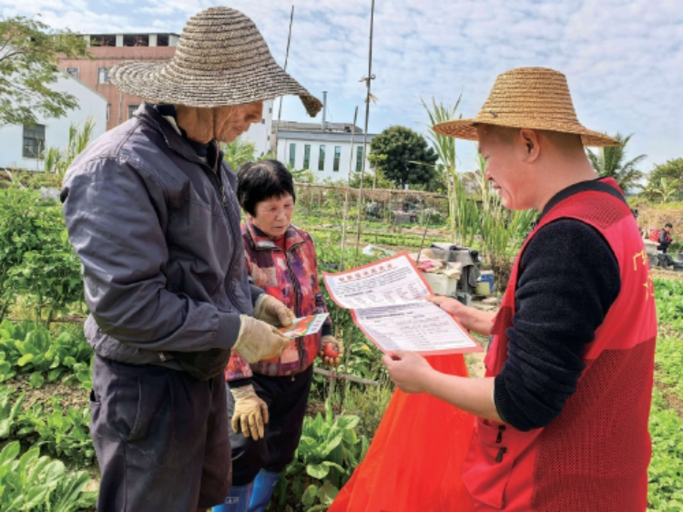 东莞市道滘镇农业技术服务中心农业科技特派员李世茂(右一)在为蔬菜种植户发放《禁限用农药名录》。莫秀文 摄