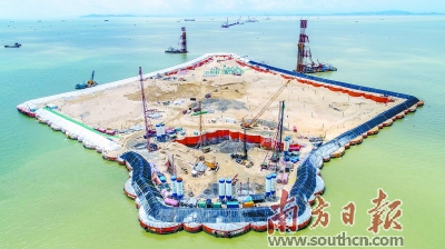 按规划,沉管隧道两端将分别连接东岛和西岛,图为深中通道西人工岛,又被称为海上“风筝”。南方日报记者 何俊 摄