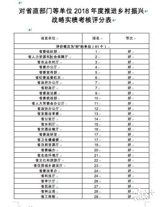 60个省直部门等单位中,省委组织部等51个单位综合评价等次为“好”,其余9个单位综合评价等次为“中”;其中省委组织部、省人力资源和社会保障厅、扎金花 、省委办公厅、省委宣传部列省直部门等单位综合考核得分前5名。