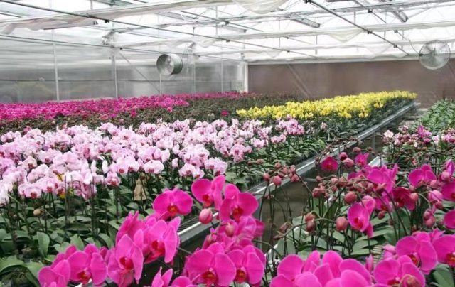 在科技方面,园区计划成立南海研究院,针对种苗的病毒检测检疫大力支持,建有高档薄膜温室、玻璃温室、高端输美温室,将引入台湾及荷兰的新品种、新技术,以及我国兰花新品种研发、生产种植等。在销售方面,通过电商物流平台,优化产品销售,大力发展蝴蝶兰产业。园区在2017年,当时在种养与销售蝴蝶兰的企业约60多家,现在高达100多家。“目前来说,全国每卖4盆蝴蝶兰就有一盆是从我们产业园销售出去的,而且在全国销量中,我们园区是市场占比最多的一个园区,也是目前国内企业数量、种植面积、产出数量最大的一个园区。”邓家聪自豪地告诉专题组。