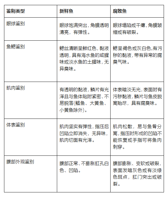 挑选鲜鱼时,可以对其眼球、鱼鳃、体表、肌肉和腹部外观进行鉴别(下表)。