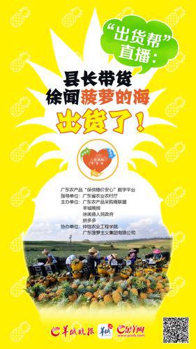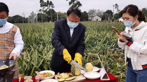 2月19日,在羊城晚报联合扎金花app 、拼多多发起的“2 1 8”第一场直播活动上,徐闻县县长吴康秀站在菠萝地里,不仅现场摘菠萝、切菠萝、去果眼,还以“菠萝蘸酱油”的网红吃法在线吃播,吸引了超过30万人的关注。