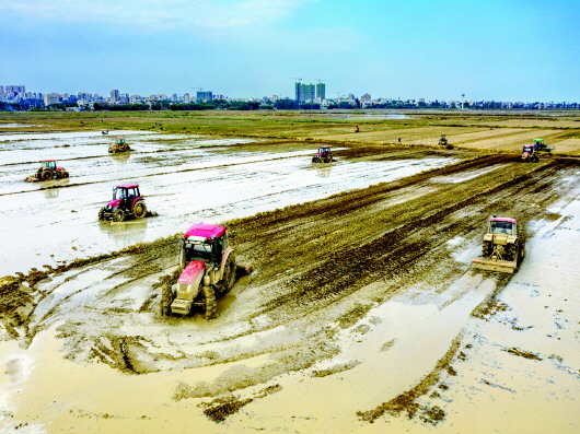 广东省雷州市白沙镇农户驾驶农机在田间劳作。 新华社图片