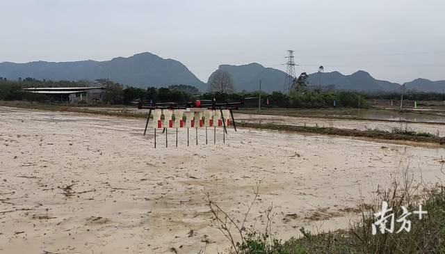 随着清远市农业农村局相关负责人的一声指令,操作人员驾驶着水稻精量穴直播机在刚灌好水的田里来回播种,十几分钟即播种完4亩地。另一边,无人机也载着种子来回播种。