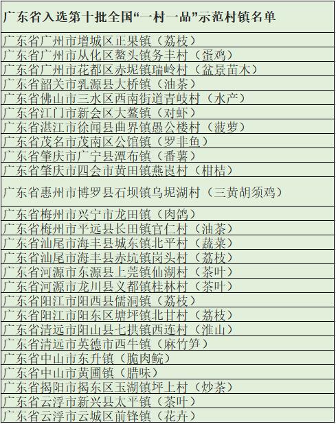 据了解,本次广东入选的26个示范村镇,主导产业囊括水果、蔬菜、水产及农副产品等;主导产业聚集程度高、新型经营主体数量大、产业融合发展势头良好等优势特点明显;产品多形成知名品牌,如愚公楼菠萝、潭布番薯、石坝三黄胡须鸡等。