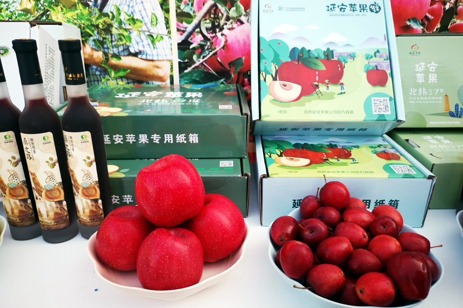 一家企业在现场展出鸡蛋大小的“袖珍延安苹果”(右)。新华网发