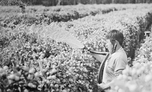 花农给年桔浇水保持土壤湿润。 吴秒衡 摄