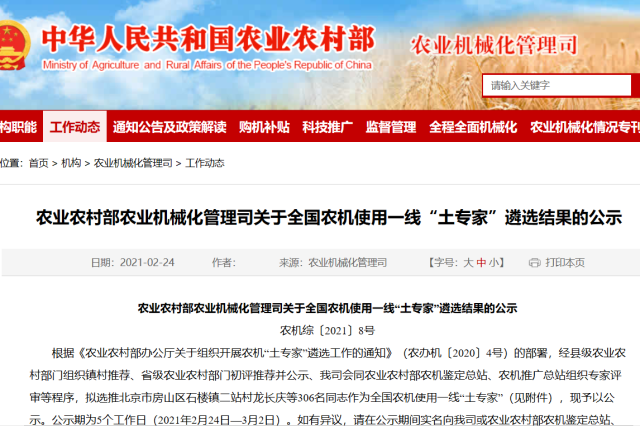 2月24日,农业农村部农业机械化管理司关于全国农机使用一线“土专家”遴选结果公示出炉 ,全国306名农机“土专家”上榜。