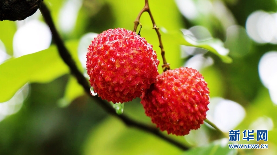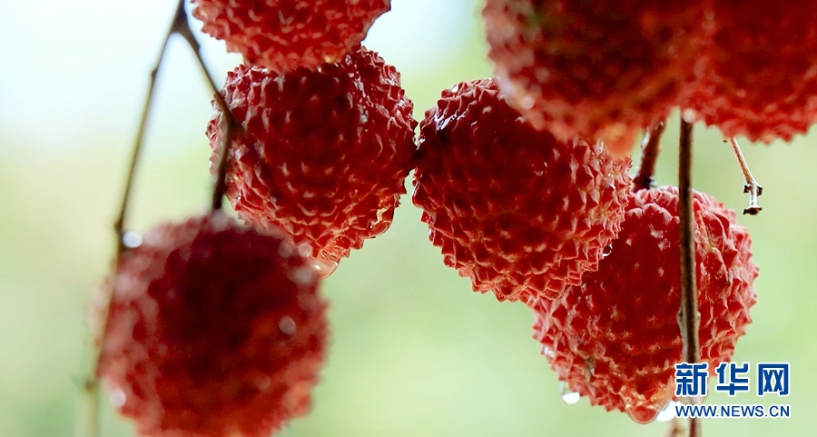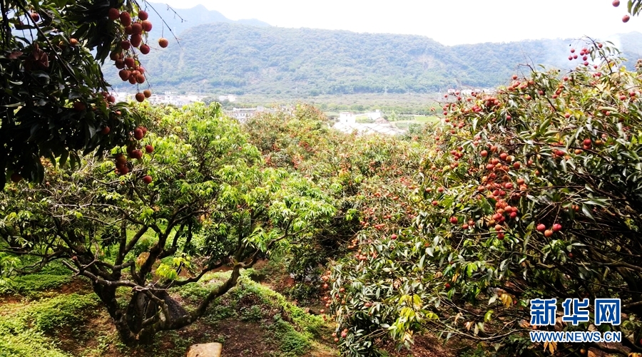 “六月南风荔子丹,皱红小碧满银盘。”六月,一颗颗圆胖鲜红的荔枝挂满枝头。新华网发(罗素玲摄)