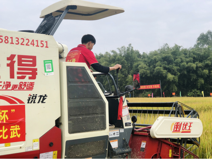 比赛现场,随着开始令下达,10名选手相继上车启动机器。伴随着隆隆声响,一串串低垂饱满的稻穗稻谷尽数收入仓中,多余的茎秆从车尾撒出,广袤的田间溢满稻香。