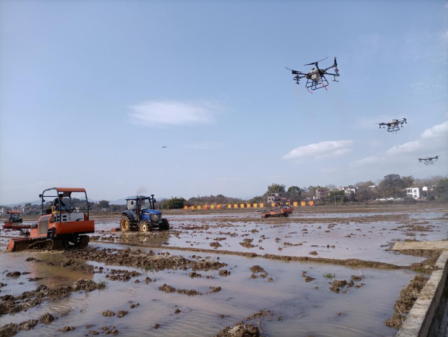 伴随着空中悬停的四部DJT30植保无人机喷出水雾,田间的数部轮式拖拉机和履带式旋耕机发出轰鸣,“河源市春季生产暨农机闹春耕现场会”正式启动。