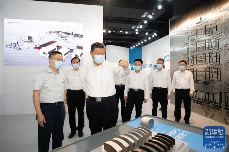 6月28日,中共中央总书记、国家主席、中央军委主席习近平在湖北省武汉市考察。这是28日下午,习近平在武汉华工激光工程有限责任公司激光科技馆,察看激光技术产业应用展品。新华社记者 谢环驰 摄