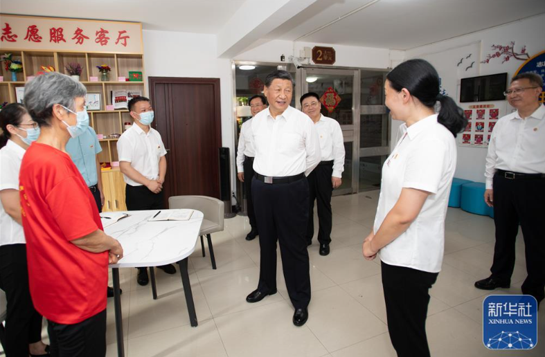6月28日,中共中央总书记、国家主席、中央军委主席习近平在湖北省武汉市考察。这是28日下午,习近平在东湖高新区左岭街道智苑社区党群服务中心,向社区工作者了解党建引领基层社区治理及便民服务等情况,并同前来办事的老年人亲切交谈。新华社记者 谢环驰 摄