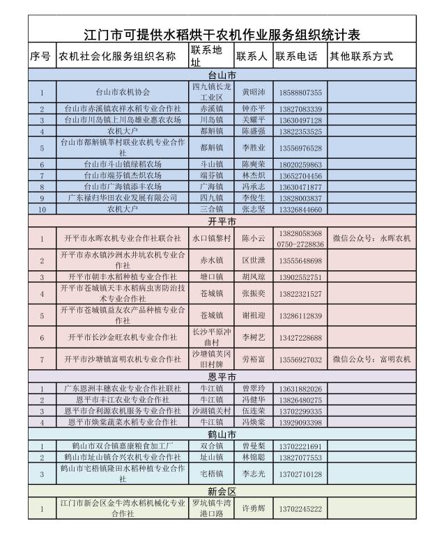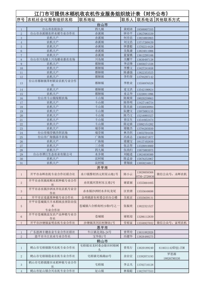 为此,江门市农业农村局梳理了一批可为农户提供水稻机收和烘干作业服务的组织名单,附上联系地址、联系人及联系电话,让有需要的水稻种植户更好地与农机社会化服务组织对接,助力夏季农忙抢收。