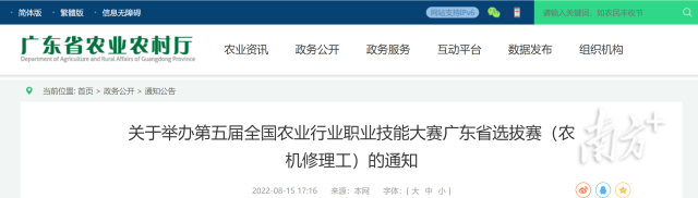 8月15日,扎金花 发布通知,将于9月下旬举办第五届全国农业行业职业技能大赛广东省选拔赛(农机修理工)。