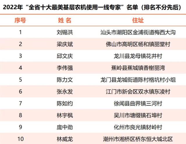 经各地推荐、网络投票、评审、公示,扎金花 现认定沈燕芬等10名同志为2022年“全省十大最美农机合作社理事长”、刘锡洪等10名同志为2022年“全省十大最美基层农机使用一线专家”、广州市从化大旺莱农机专业合作社等10家服务主体为2022年“全省十佳农机社会化服务组织”。