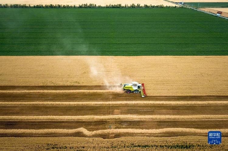 联合收割机在新疆昌吉回族自治州奇台县大泉塔塔尔民族乡的麦田里收割小麦(2022年7月7日摄,无人机照片)。新华社记者 张啸诚 摄