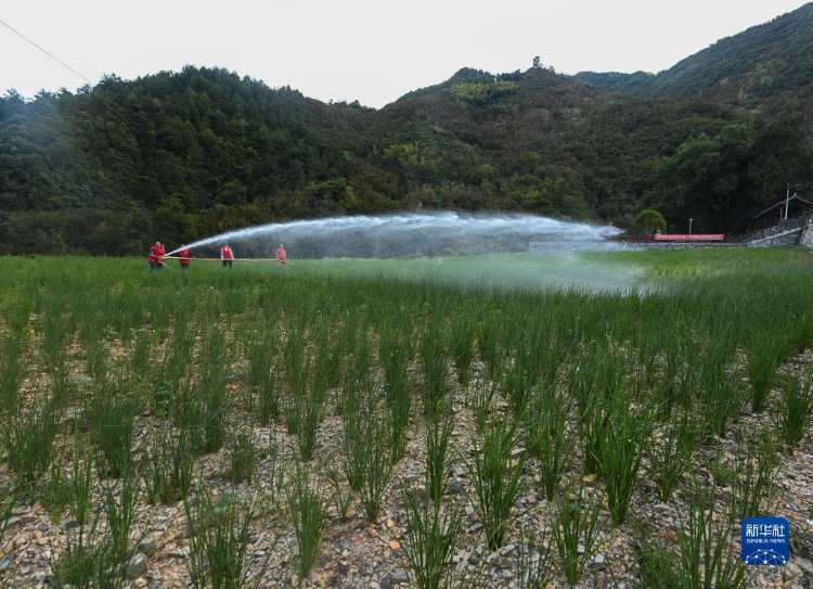 在浙江省淳安县屏门乡金陵村徐家庄自然村的高山生态旱稻田内,党员志愿者在浇灌受干旱影响较为严重的稻田(2022年8月21日摄)。新华社记者 徐昱 摄